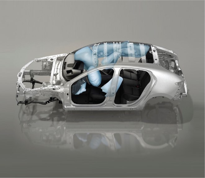 Mazda3 trang bị 7 túi khí, bao gồm túi khí đầu gối cho tất cả các phiên bản – điều này nhằm giảm áp lực quá mức từ dây đai an toàn, giúp cho người sử dụng không bị trượt khỏi dây đai khi va chạm. Đây là tiêu chuẩn an toàn duy nhất và vượt trội trong phân khúc C hiện tại. Bên cạnh đó, thân xe được sử dụng thép cường độ cao giúp gia tăng độ chắc chắn của thân xe.